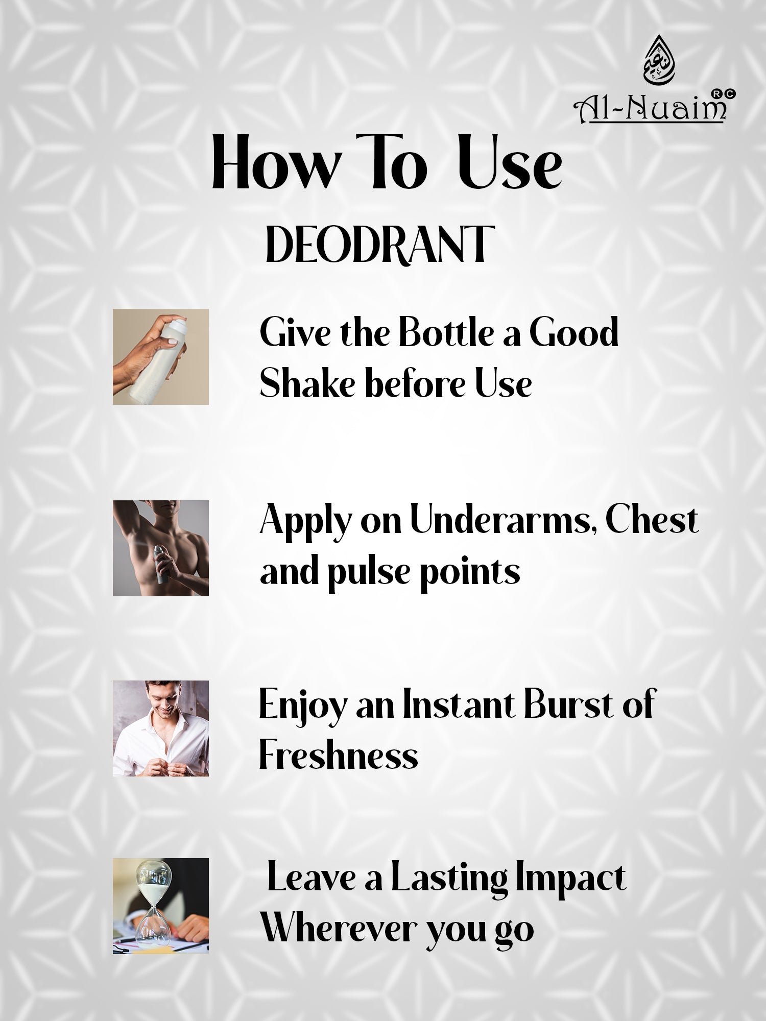 Discover Al-Nuaim's luxurious range of stimulating, non-alcoholic body sprays. Our long-lasting, urbane blends, from royale to classic scents, effectively combat odor-causing bacteria. Each elegant fragrance is crafted to provide a regal presence, helping you stay fresh and outrun bad smells instantly.