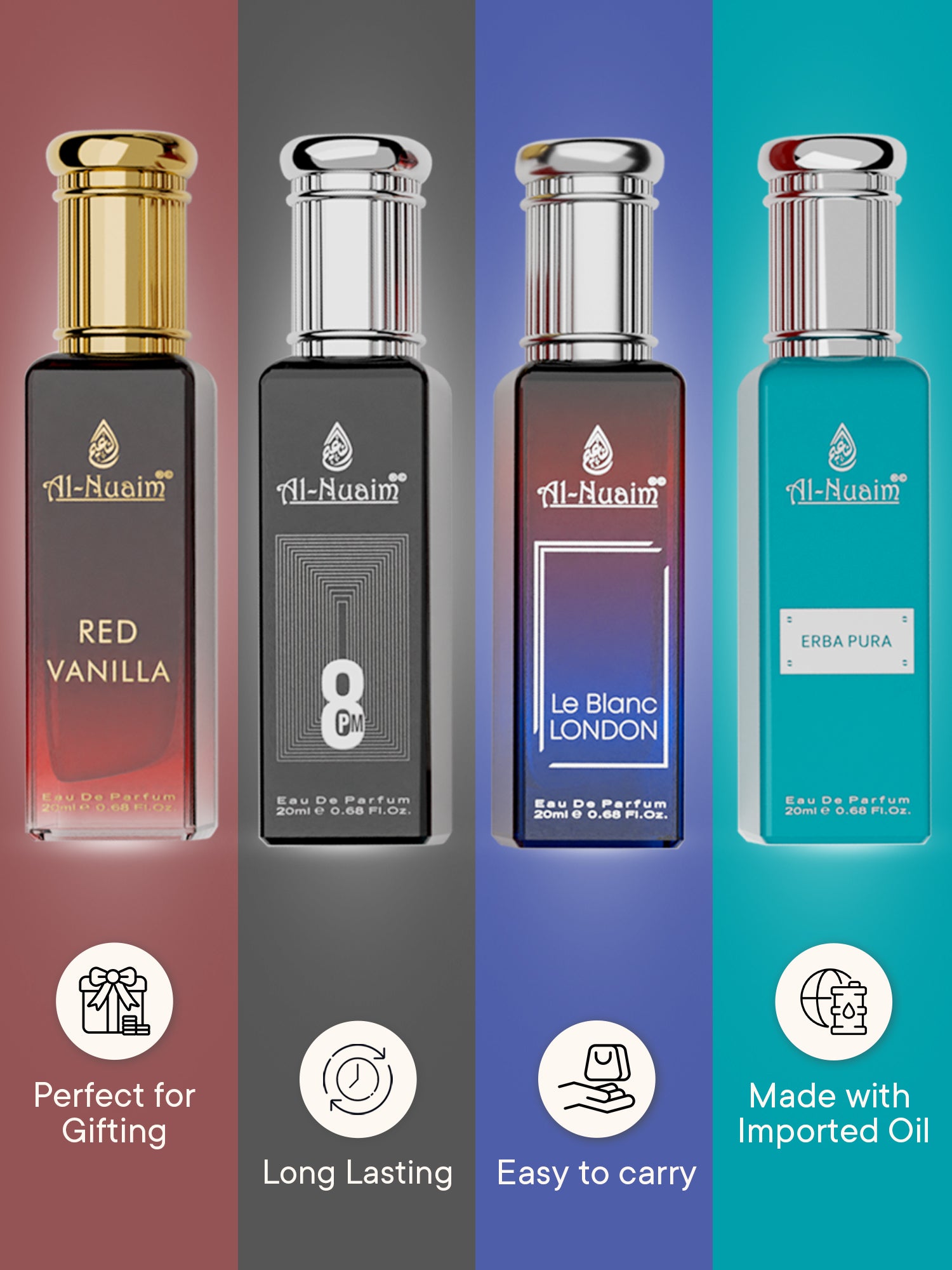 · Upgrade your fragrance game with ERBA PURA (20 ML), RED VANILLA (20 ML), LA BLANC LONDON (20 ML), and 8 PM (20 ML). Crafted with precision, each scent promises a memorable experience.