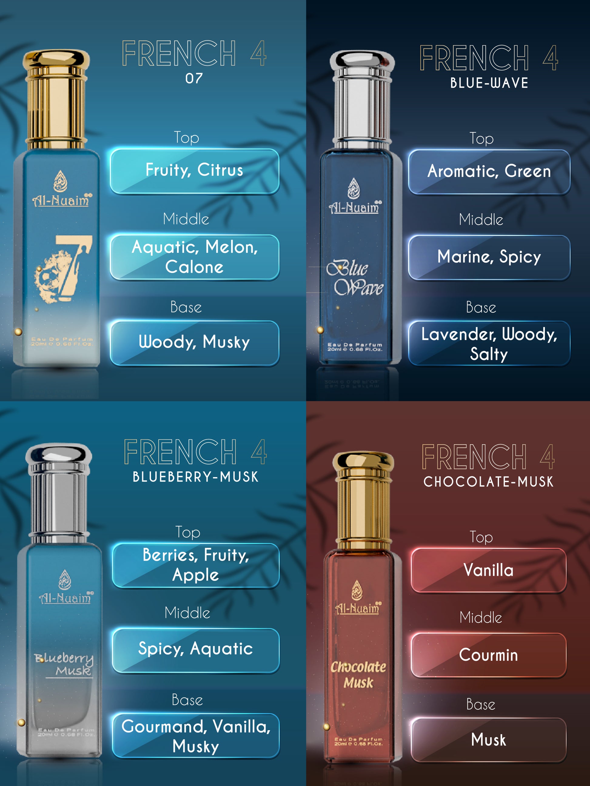 · Elevate your scent collection with Blue Wave (20 ML), Blueberry Musk (20 ML), CR7 (20 ML), and Chocolate Musk (20 ML). Each fragrance, meticulously crafted, ensures a memorable olfactory journey.
