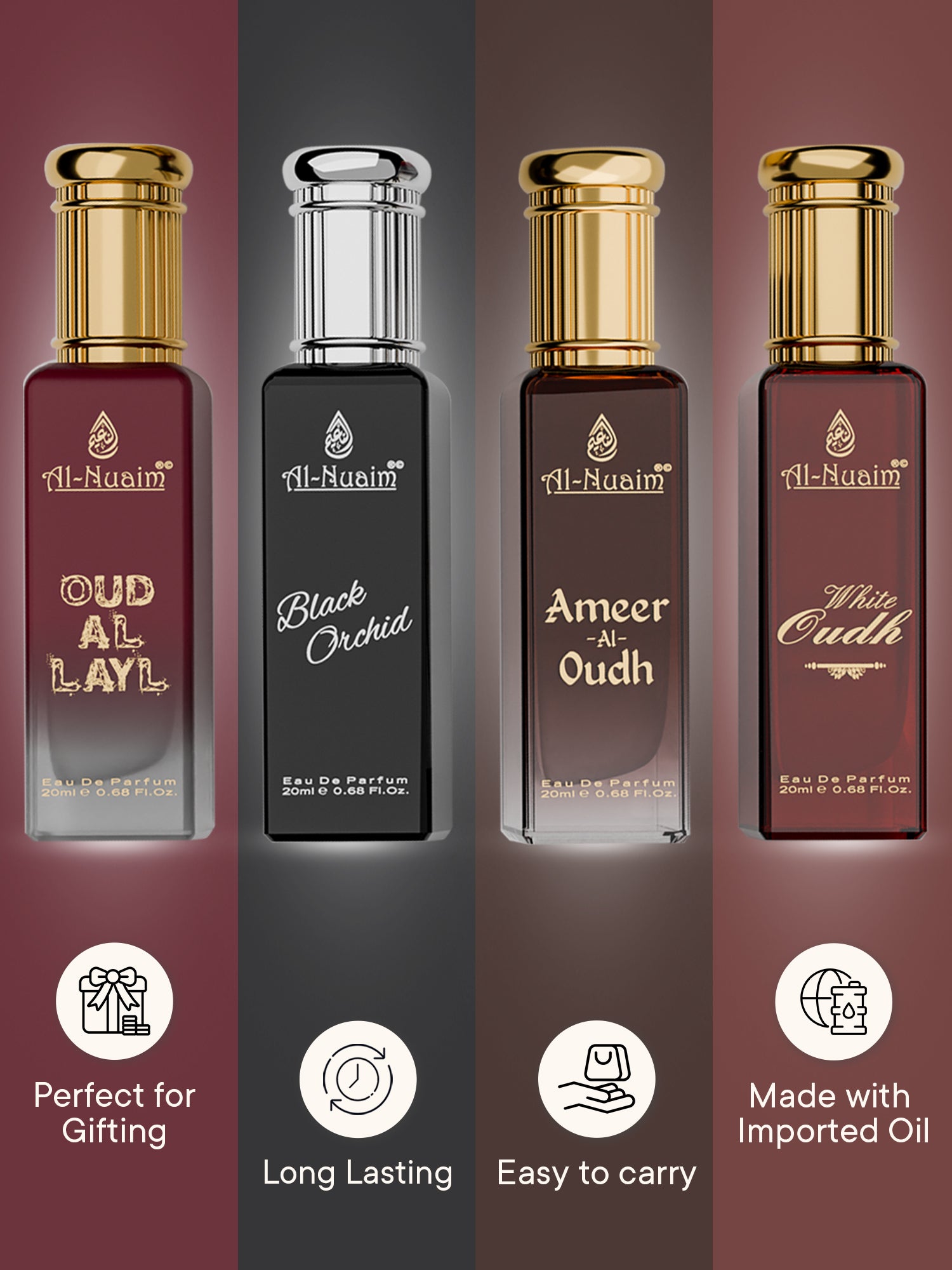 · Experience luxurious fragrances at unbeatable prices with the Al-Nuaim Perfume 20 ML Elite 4 Unisex Discovery set!
